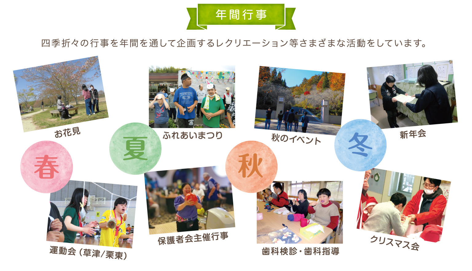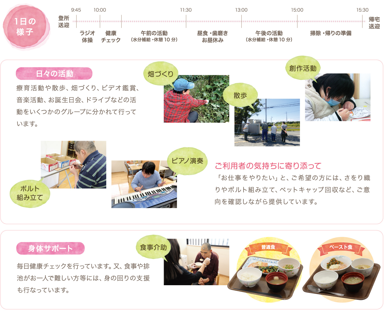 食事、排せつ等身の回りの介護をはじめ、楽しみ、喜びのある生活の実現を目指して、一人ひとりのペースを大切に、特性・ニーズに合わせた環境と支援のもと、軽作業等生産活動の他、畑づくり、ドライブ、散歩といった外出やボールを使った運動、音楽活動、創作活動、四季折々の行事を年間を通して企画するレクリエーション等さまざまな活動を通して、豊かな生活づくりと安定した日常生活につながるよう支援します。