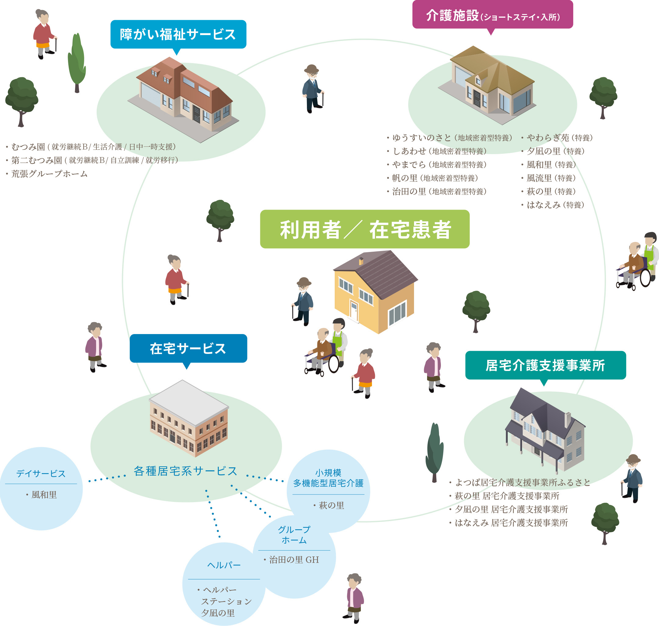 滋賀県草津市を中心に、特別養護老人ホーム・デイサービス・グループホームなど、多岐にわたる福祉事業を展開してまいりました。グループの規模が大きくなることは、地域の皆さまから求められる役割も大きくなります。この地に暮らす皆さまの生活をよりトータルで支えていけるよう介護・福祉に関わる生活全般の問題に対応する総合的な仕組みづくりを目指しています。